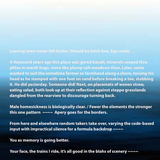 “Barge” is joined by many other poems observing water and the shore, “The Dive,” “A Quick Dip,” “The Sea,” “The Garden by the Sea,” as well as the 10-page title piece that offers prose impressions of Oslo, a swimmer thinking his way through currents of muscle movement and sensation parallel to motions and acts remembered or anticipated. Bicycling uphill “Esther was in front, and Oslo could see her back shifting from side to side as she increased her effort, and he suddenly imagined her thighs.. the exercise they must be undertaking to propel her..”