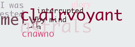 The language of these poems, as I view it, is divided into three categories with regard to text rewrites -- almost raw, barely retouched and lightly reworked -- which underscore New York poets' sustained belief in the sacredness of first-thought-best-thought. The late Edwin Denby's gift for straightforward first-thought declaration is exemplary: "The cat I live with is an animal..." strikes me as primal utterance but layered with a darkness I might want to characterize as tart, overall. Similarly, the undetermined first associations of a talent like Clark Coolidge ("...'Gosh!', hyphen / ledge it glow harm...") constitute sophisticated wordplays without being pretentious; this is first thought or perhaps lightly reworked text operating within multifaceted vectors, of course, but not unduly fanciful.
