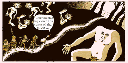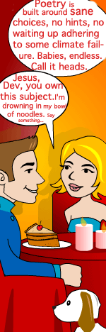 I assume, above, most everyone reading these paragraphs knows about Gary Sullivan, tupperware lady of flarf, inc. But I'll argue you best intake his humor without having to slap a label on it. These texts don't come out of Google by themselves, and the signature tones are not just about unfiltered outrage and inappropriate noise. The poems document extreme craft that is GS's own parvalue -- timing, tongue-in-your-cheek lexicon, barbarous targeting. (And since one of the enduring features about flarf is that nobody comprehends what it is or where it's headed, let's just say GS is funnier than poets have to be, and that's an uphill effort, unless you start out strong.) GS got things rocking with this: